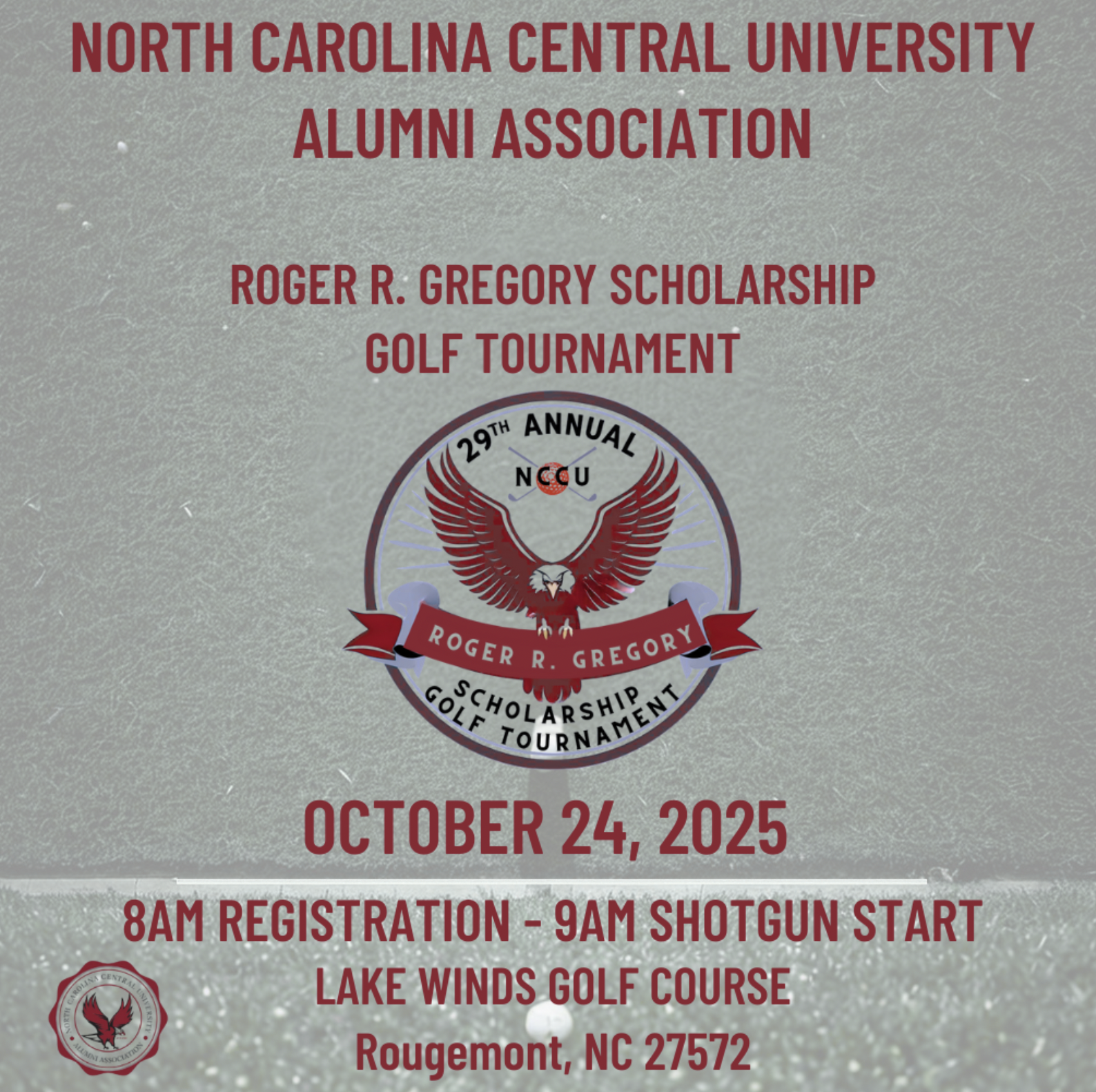 The North Carolina Central University Alumni Association Roger R. Gregory Golf Scholarship Tournament began in 1996. It has continued to honor the legacy of Roger R. Gregory and to raise funds for current students at North Carolina Central University. The tournament serves as a one of the main source of funds for the Association’s scholarship awards.His LegacyRoger R. Gregory was a proud alumnus of North Carolina Central University (Class of 1971), a dedicated leader, and a passionate advocate for education and community service. With a career spanning over two decades in human resources, he returned to Durham, North Carolina in 1989 to serve as the Director of Human Services at North Carolina Mutual Life Insurance Company. He was later appointed as the Director of Alumni Affairs at NCCU in 1999 and made an everlasting mark on the university and its alumni network.After serving as the President for New York, New Jersey and Durham Chapters, he proudly served as the two-time National President of the NCCU Alumni Association, making him the youngest President in alumni association history. Roger was a lifelong supporter of the university, earning honors such as Alumnus of the Year in both 1982 and 1992. In addition to holding several leadership roles within the alumni chapters, he was also a staple with several community organizations across New York, New Jersey, and North Carolina.Roger was a life member of Alpha Phi Alpha Fraternity, Inc., where he served at the local, state, and regional levels, mentoring students and leading initiatives with passion and purpose. His legacy of service, leadership, and unwavering Eagle Pride continues to inspire generations of NCCU alumni and supporters.Today, the Roger R. Gregory Golf Scholarship Tournament is held in his honor as part of NCCU's National Alumni Association’s fundraising efforts during Homecoming celebration, supporting student scholarships, and continuing the mission he championed so fiercely.